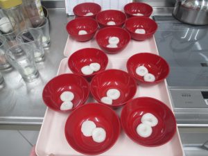 次に白玉粉を水で固めて、まん丸くしてから茹でてこんな感じになります