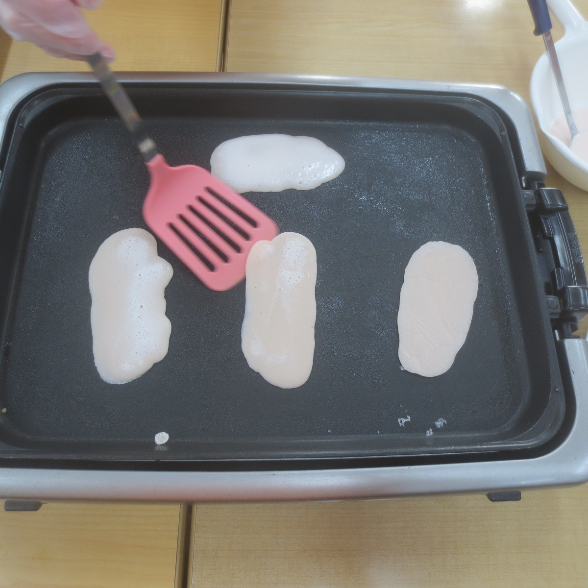 ホットプレートを140℃くらいで温めます油をぬって焼きます