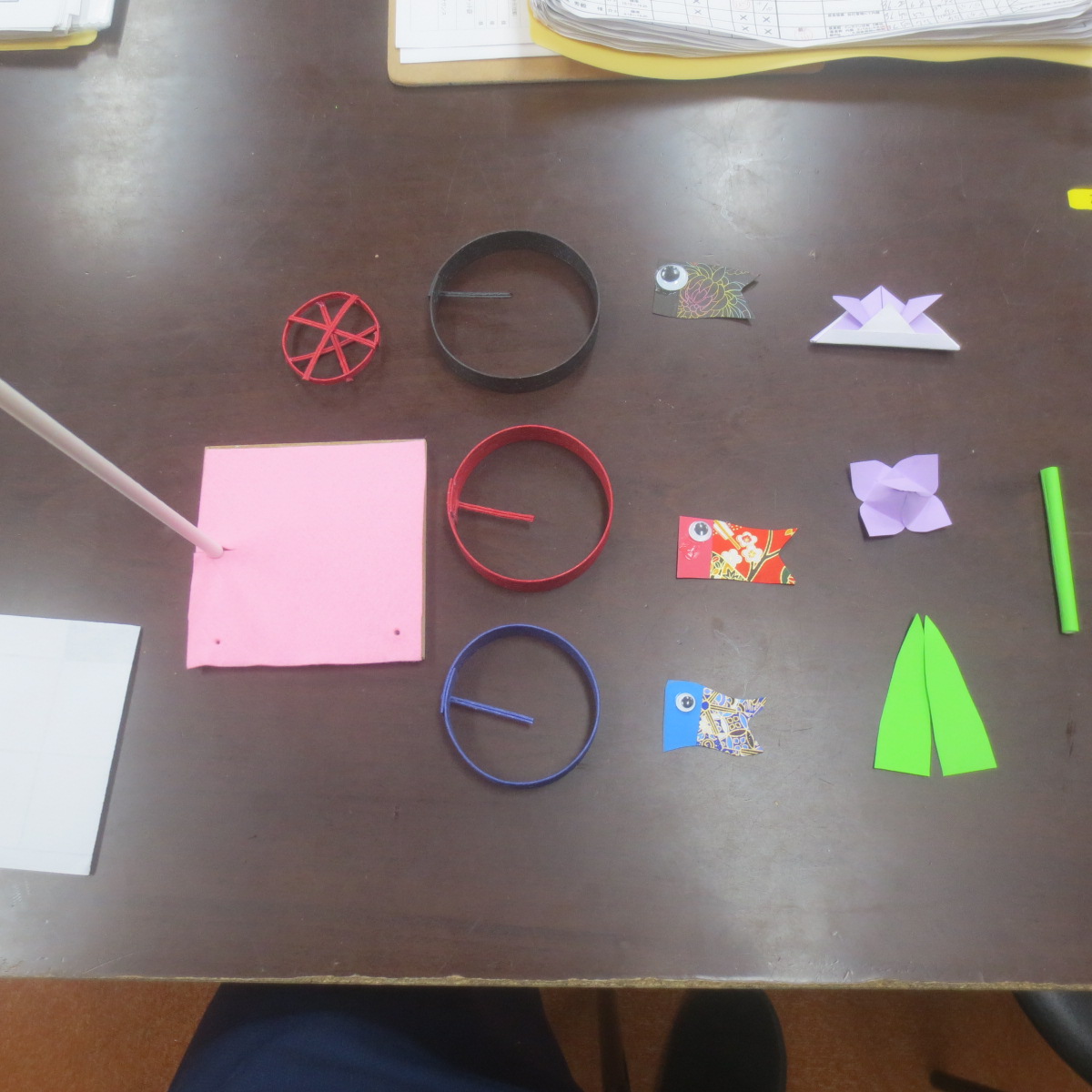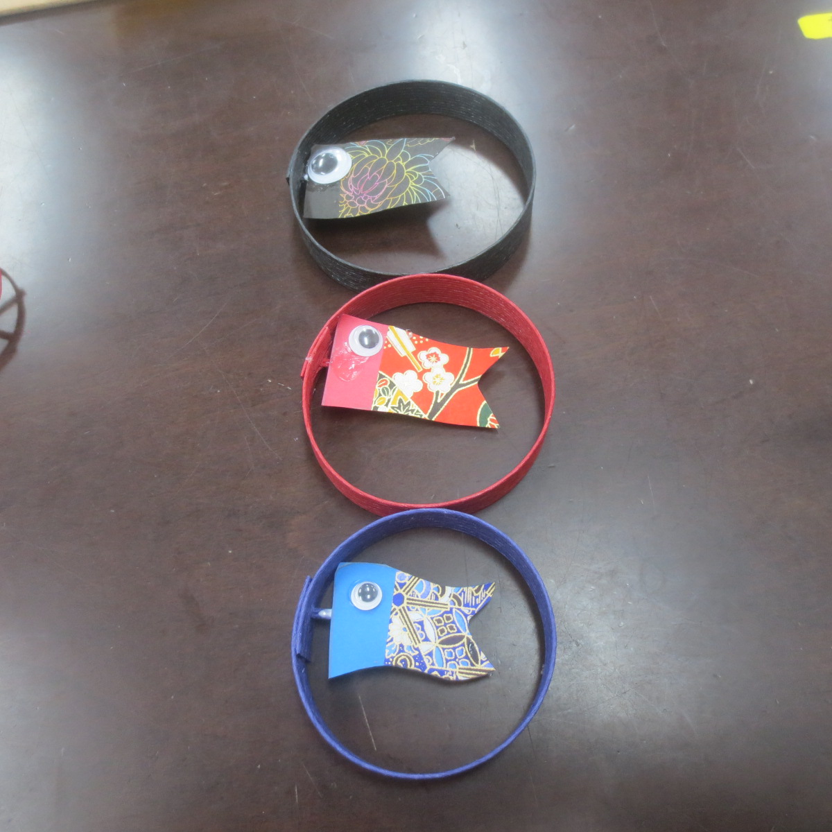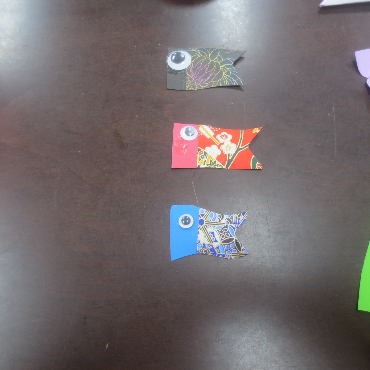 ①鯉の形の画用紙に和紙の折り紙貼って、鯉の形にカットして、目を貼ります。