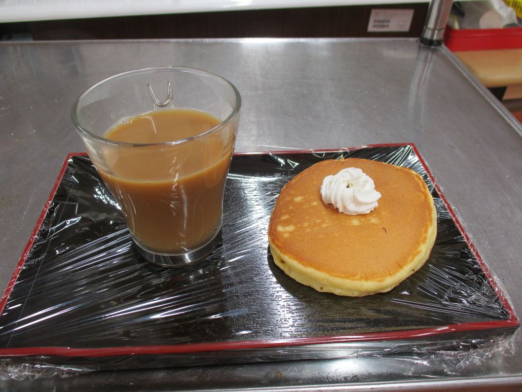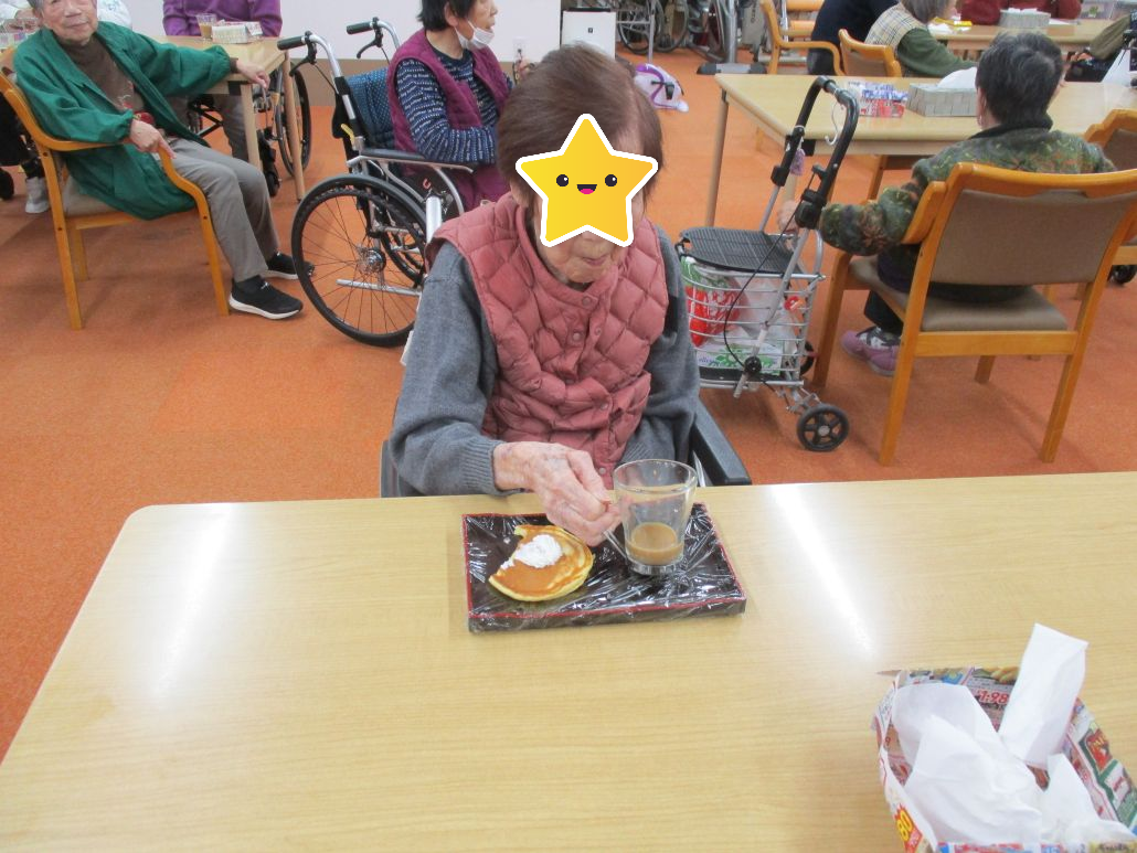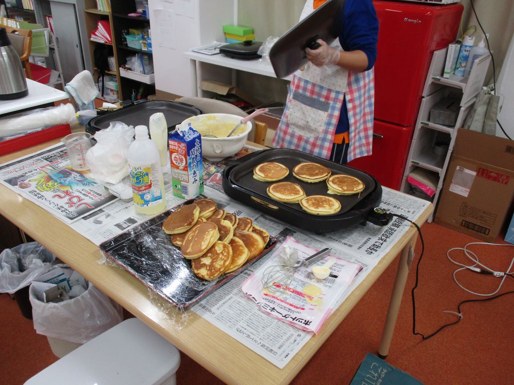 ホットケーキにホイップクリーム添え作り、皆様に提供しました。大変美味しいと喜んでました。