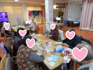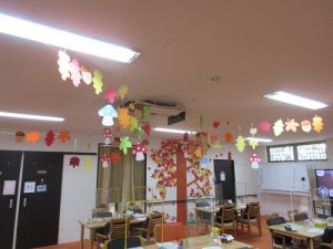 利用者様が帰った後は、完成した飾りを天井から吊るしたり、壁に貼ったりして飾りました 。