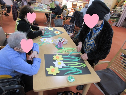 みんなで一緒に水仙作り! 2026/2/26 2026/2/26 デイサービス笑楽 門真 皆さんこんにちは☻ 今週の門真は、水仙のお花をみんなで作りました。 同じテーブルの方々とペアになり、花の配置を考えたりコミュニケーションを取りながら 楽しく取り組んでおられました! とっても綺麗な作品に仕上がりました。是非ご覧ください★