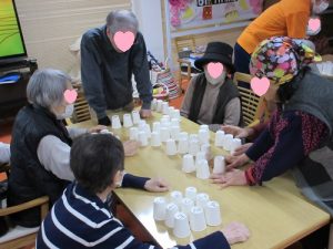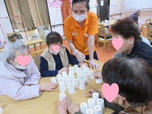 紙コップを使った言葉作りや、ティッシュボックス積み、麻雀、ボードゲームなど、みんなで楽しい時間を過ごしました。