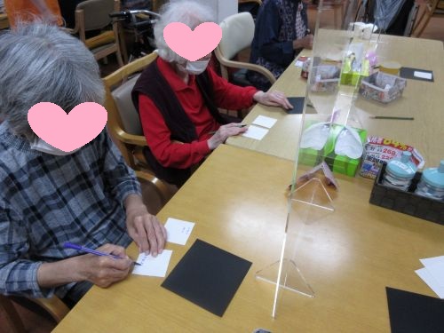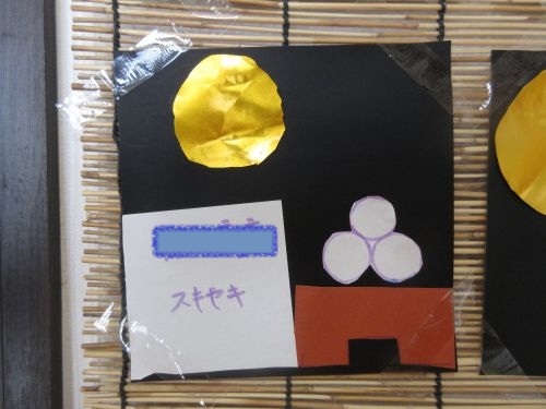 白い紙にはご自分の好きな食べものを書いて、もう一枚はお月見団子を切り出してもらいます。