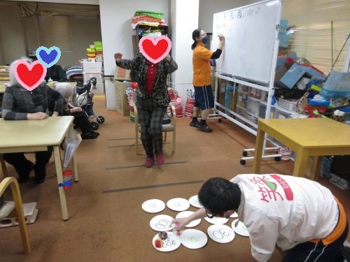 今日はそんな寒さを吹き飛ばしたいという思いで、利用者の皆様には、しっかりと身体を使った運動レクリエーションに参加して頂きたいと思います。