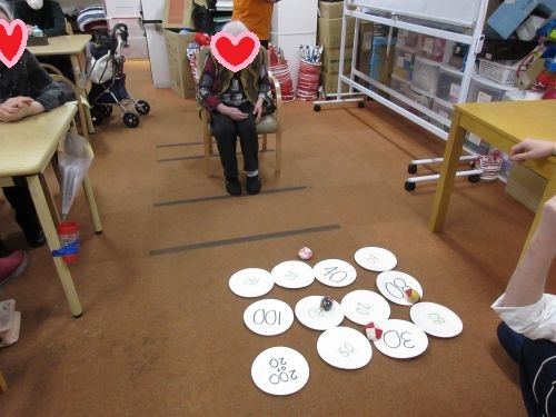 紙皿の上に点数を書いてます。その上に乗っかればそれが得点になります。