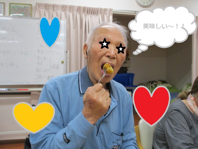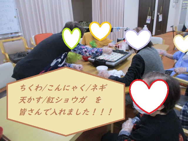 11月のおやつレクは・・・・?(#^.^#) 2025/11/8 2025/11/8 デイサービス笑楽 長原 たこ焼き です!! 卵不使用ですが、豆乳を使用し満足感アップ(*´▽`*) たこの代わりにちくわをふんだんに!! 鉄板のやけどに気をつけながら、 皆さんで作りました。 『こっち入ってない~』『ここ入りすぎや~』『まだ早かった~』 等など。協力したからこそ美味しいのが出来ましたね(^^♪ おいしいお顔をお届けしました!! 次回をまたお楽しみに(*´▽`*)