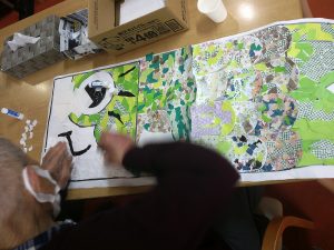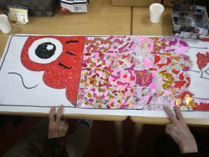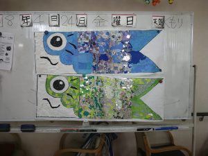 うろこを何枚か貼り付けた状態でしたが段々と顔も出来上がり鯉のぼり🎏らしくなってきました。