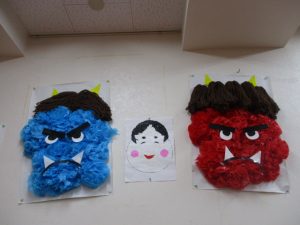 お花紙を折り折りして、開いて、敷き詰めて、大きな赤鬼と青鬼が完成しました。