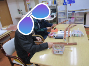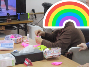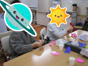 先週の笑楽は壁画レクをしました!去年のこの時期の壁画はひな祭りをしましたので、今年のテーマは「花より団子!」です。☺