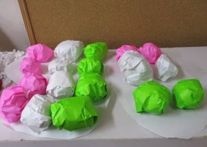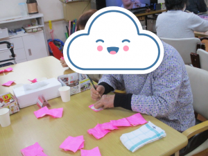 ピンクのお花紙を裂いた後、ハサミでひたすら細かく切る!😆