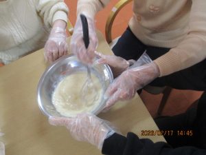 ボウルを押さえる係と混ぜる係に分かれ、とっても美味しい生地ができました!