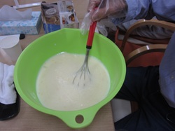 皆さんに、ボールの中に牛乳・砂糖・卵を入れて