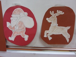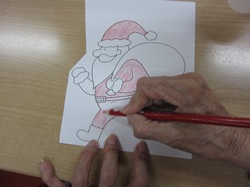 そして、色塗りしたサンタとトナカイを画用紙に貼って周りを切ります。