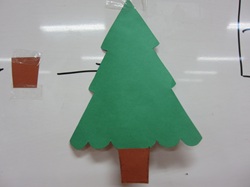 クリスマスツリーの型を画用紙に貼って周りを切ります。
