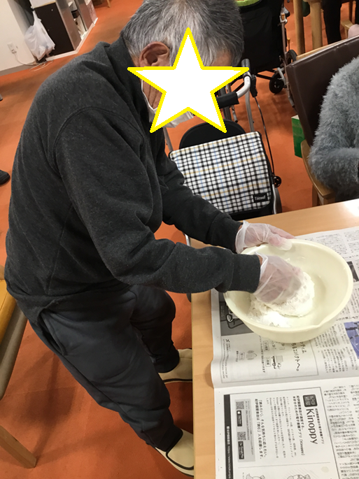 男性利用者様の力で力強くこねていただき、綺麗な団子になりました!