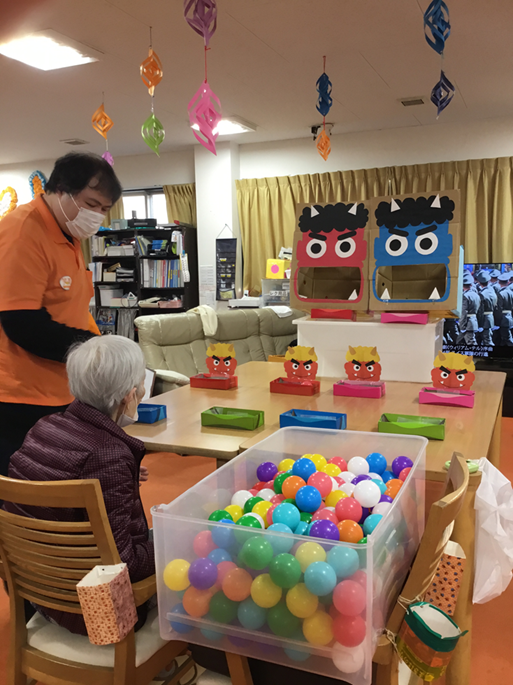 節分レクリエーション 2026/2/6 2026/2/6 デイサービス笑楽 八尾 今日は節分レクリエーション!手作りの巨大赤鬼・青鬼を相手に鬼の口の中に玉を入れるゲームで盛り上がりました。「鬼は~外!」の掛け声とともに、皆さまの全力投球が炸裂しました。 しっかり笑って、心の鬼も退治完了。 今年も皆さんにたくさんの福が訪れますように。 2月もまだまだ寒いですが、皆さま体調管理に気を付けてください。 八尾より川畑がお送りいたしました。