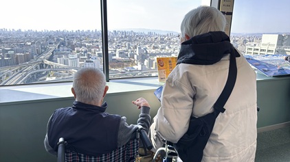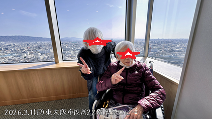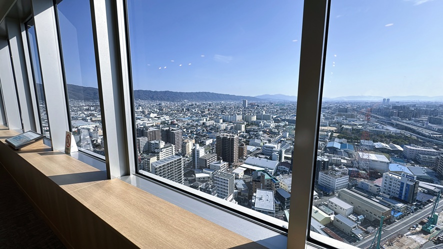 エレベーターを降りてから 景色が見える所へ行き、皆さん一斉に「すごーい!!」と感動の一言、「あれ、生駒山やな~」とか「あべのハルカスや!」と景色を見てテンションも上がっていました。