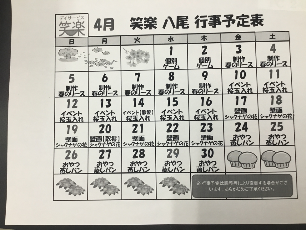 4月になりましたね(*^^)v ~八尾~ 2026/4/3 デイサービス笑楽 八尾 みなさまこんにちは(^^♪ ようやく暖かくなり、桜も満開🌸🌸🌸 でも雨が続くような感じで桜は散っちゃうんですかね😣 4月の予定です。 今日から制作 【春のリース】が始まります。 その様子は次回のブログで報告できると思います。 では、まだ気温の差が激しいので風邪などひかないようにしてくださいね。 八尾より 浜田 がお送りいたしました。