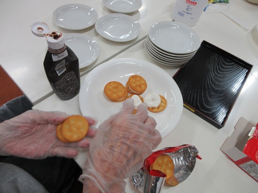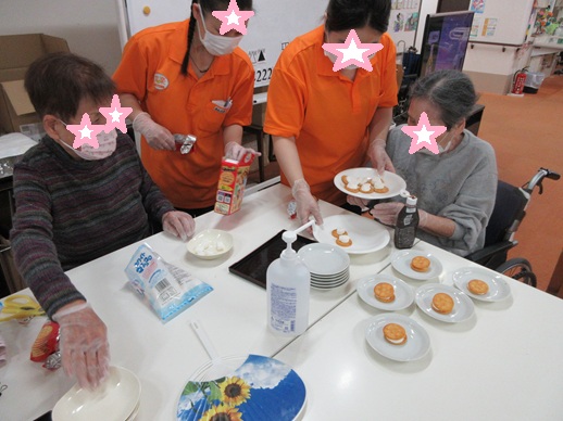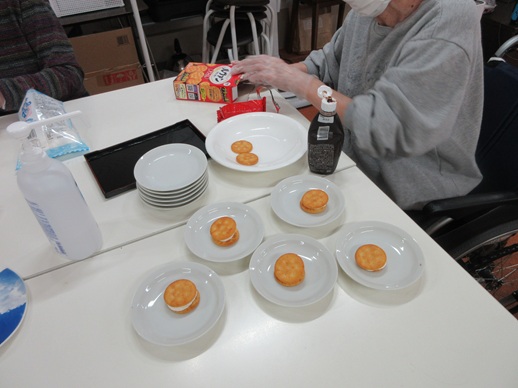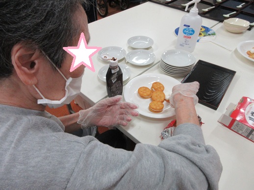 利用者さんが一生懸命にクッキーに温めたマシュマロを挟んでいます。みんなに美味しく食べて貰おうと、熱意がこもっていますねぇ~😊❗